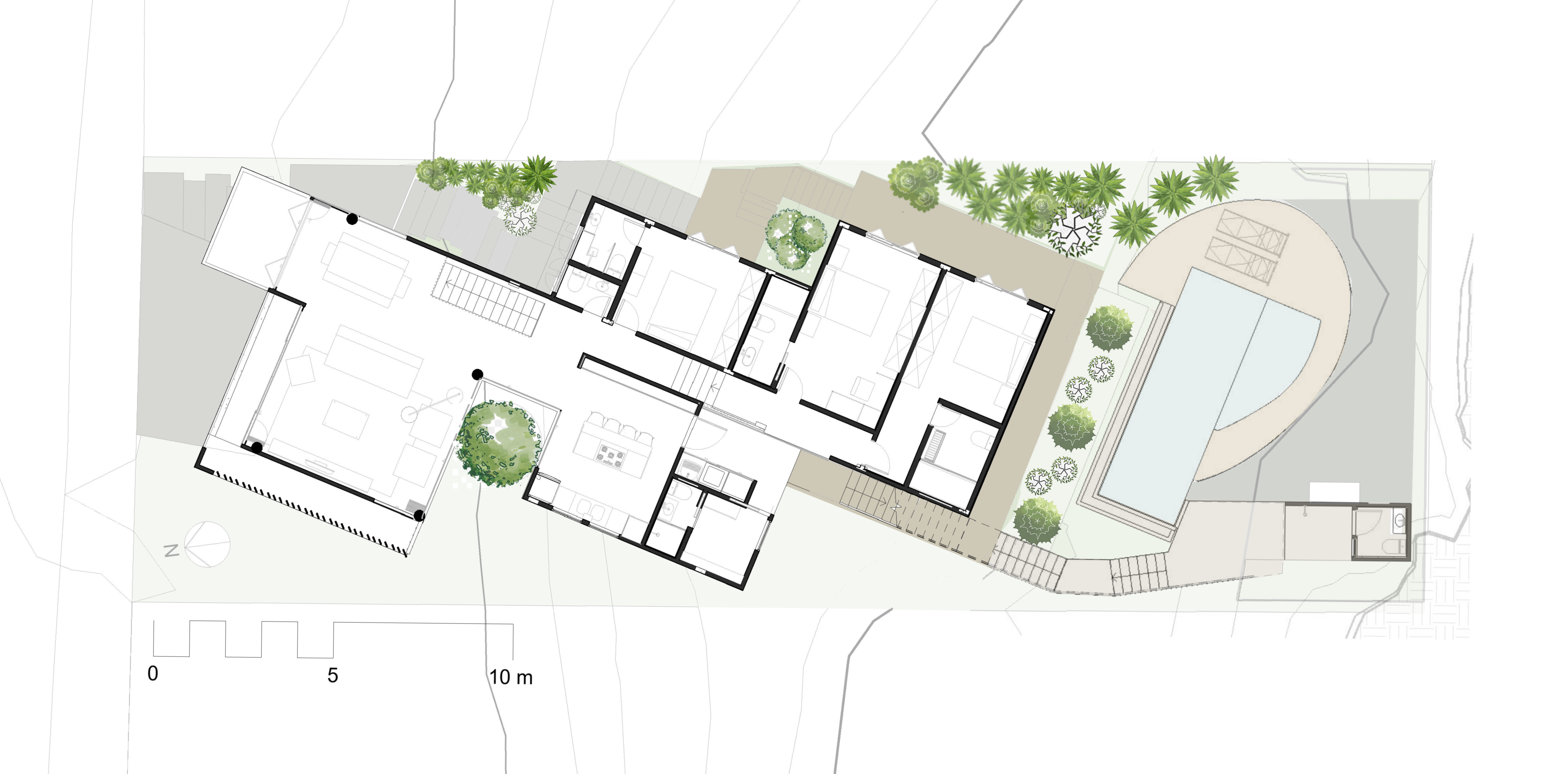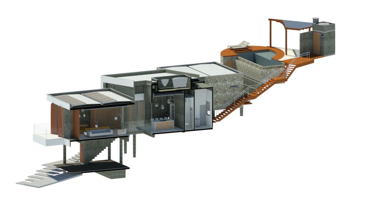 Este projeto residencial foi elaborado para uma família muito carismática que ama receber visitas e estar com a casa cheia. O conceito do projeto surgiu a partir da ideia do acolhimento representado no abraço, e os primeiros desenhos foram feitos com base nesta ideia. Como resultado, obtivemos uma volumetria levemente rotacionada em relação ao terreno, cujo aclive proporcionou um movimento nos volumes, que é percebido quando visto de lado ou de cima. O aproveitamento da ventilação e iluminação natural foram pontos importantes neste projeto, priorizando a redução do consumo de recursos não renováveis.